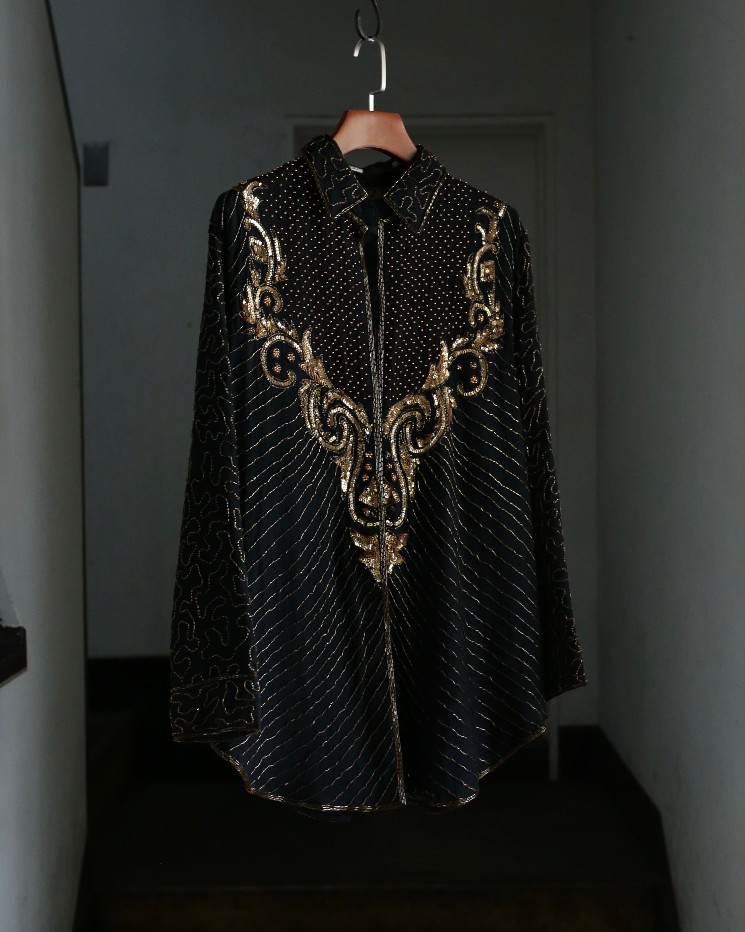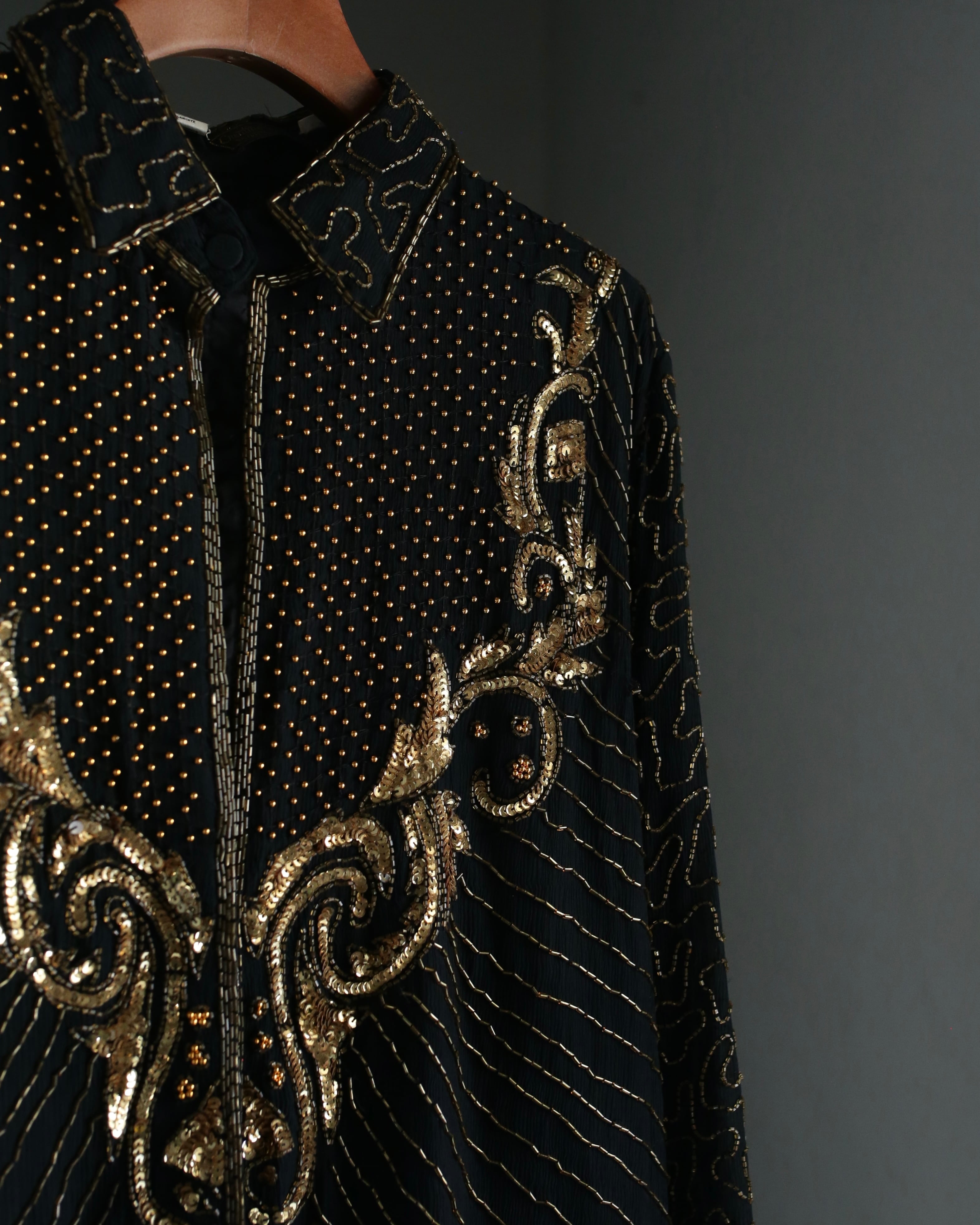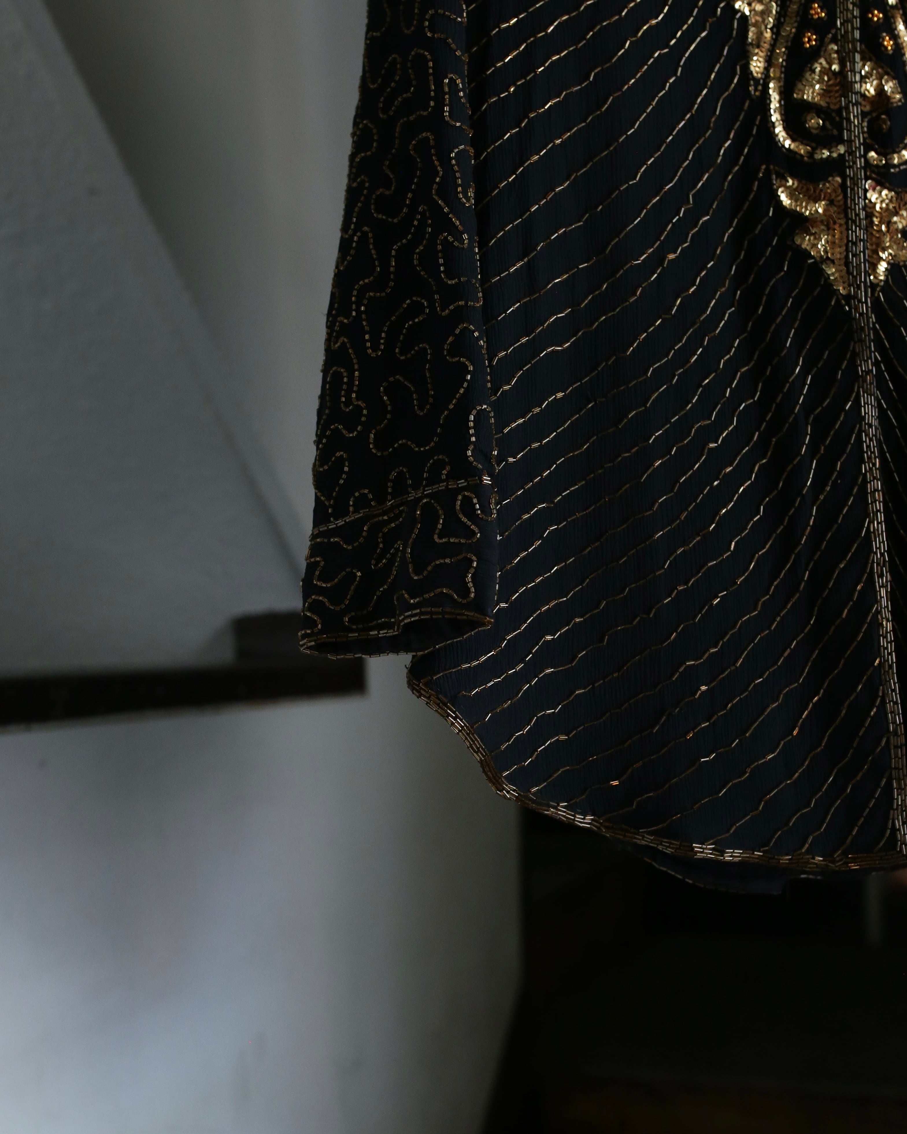 ブラックのシルクシフォン生地に、贅沢なゴールドの様々なビーズとスパンコールの刺繍。