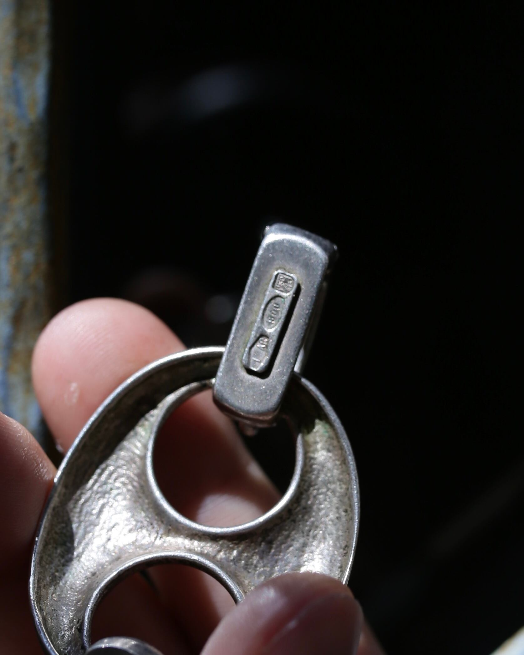 大振りなコマのデザインで、どこかインディアンジュエリーのようなニュアンスもあり、シルバー800の無骨な質感が派手すぎない塩梅に落ち着かせてくれています。