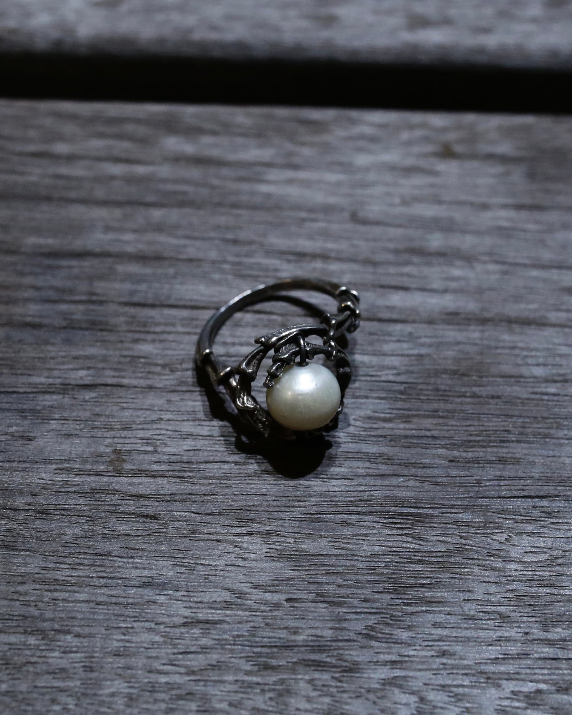 淡水系のパール、周りには薔薇の蔦が有機的に飾られた指輪。