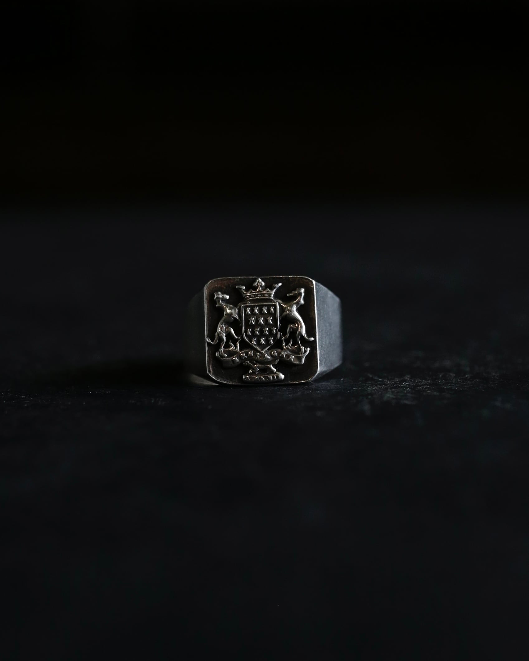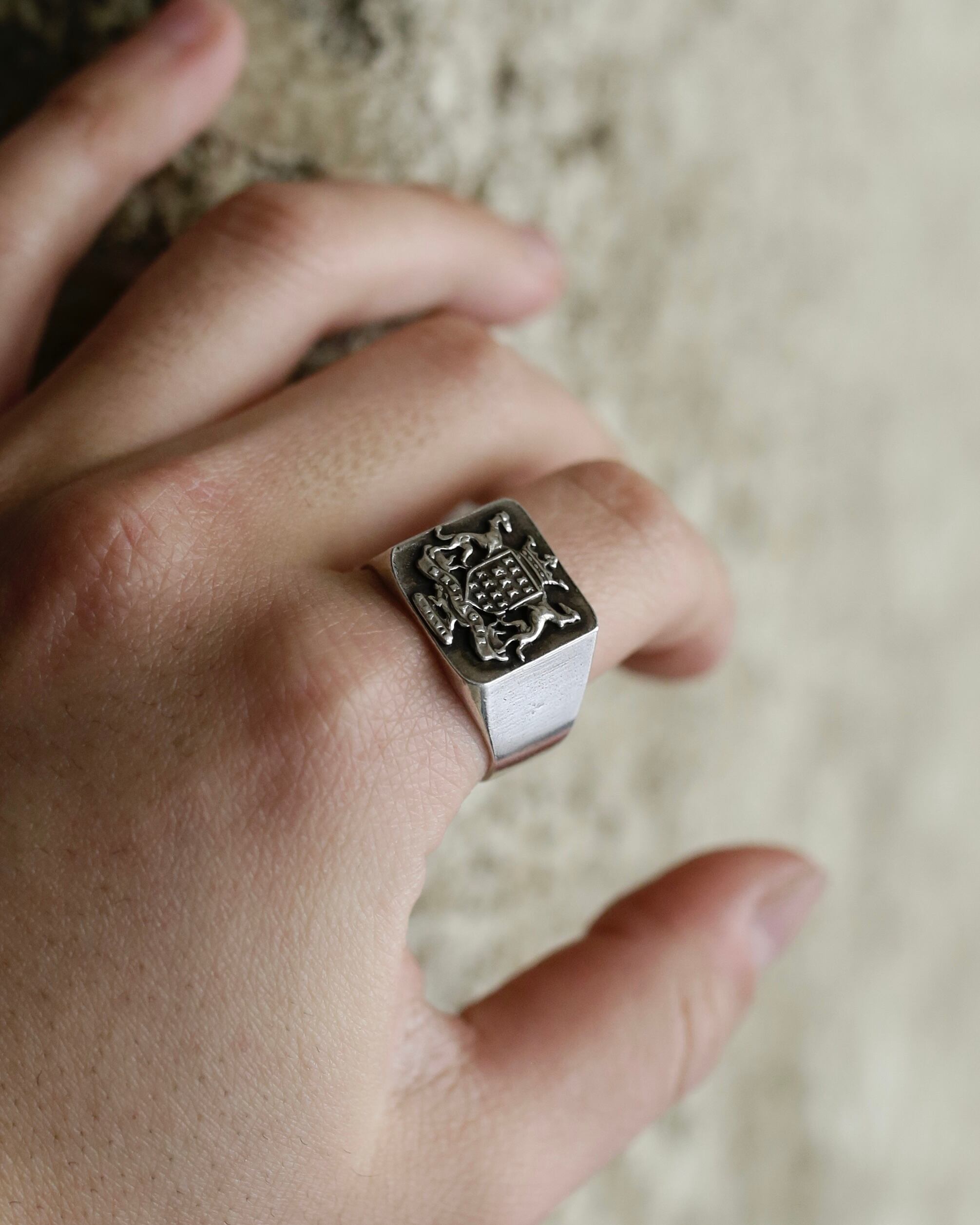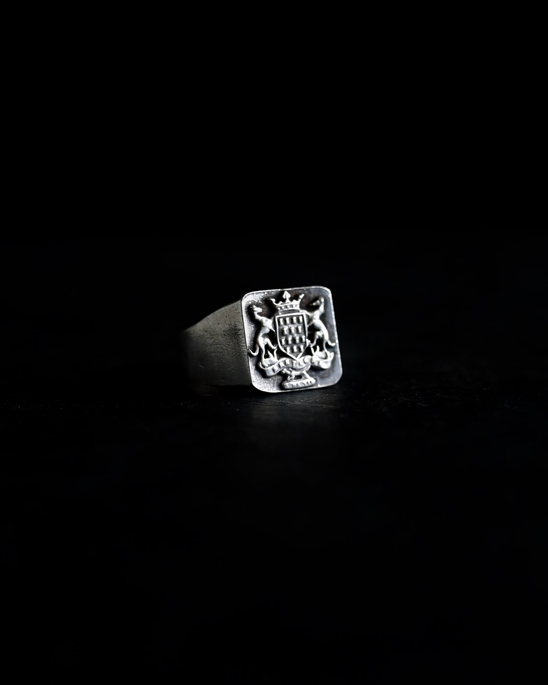 紋章モチーフのシグネットリングの中でも、特に質実剛健なデザインに惹かれます。