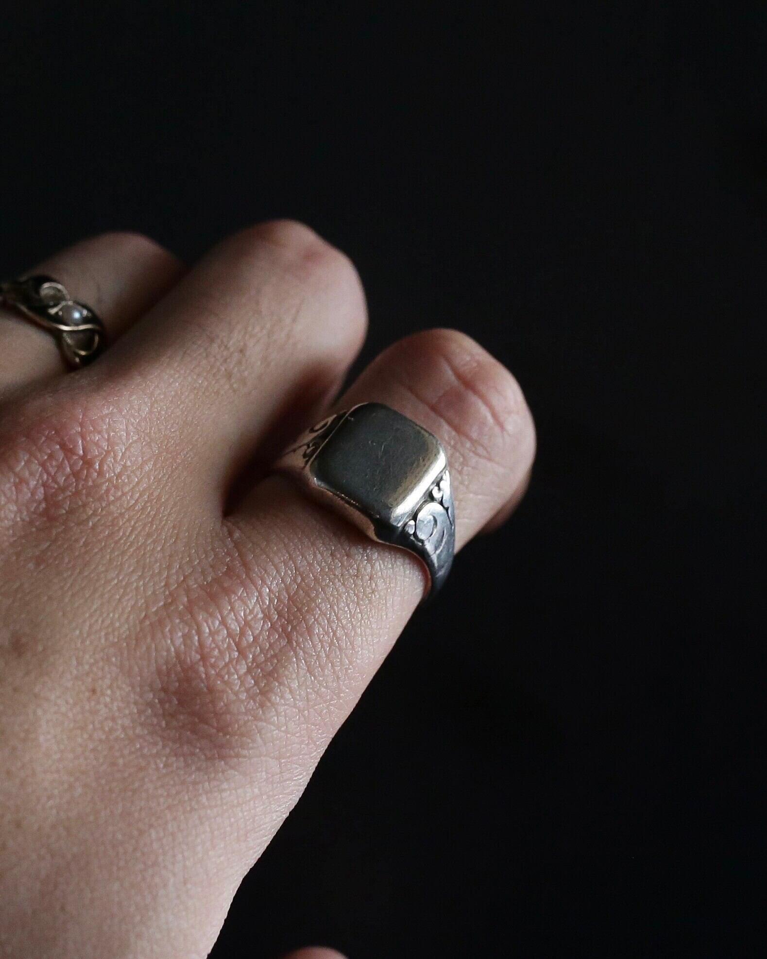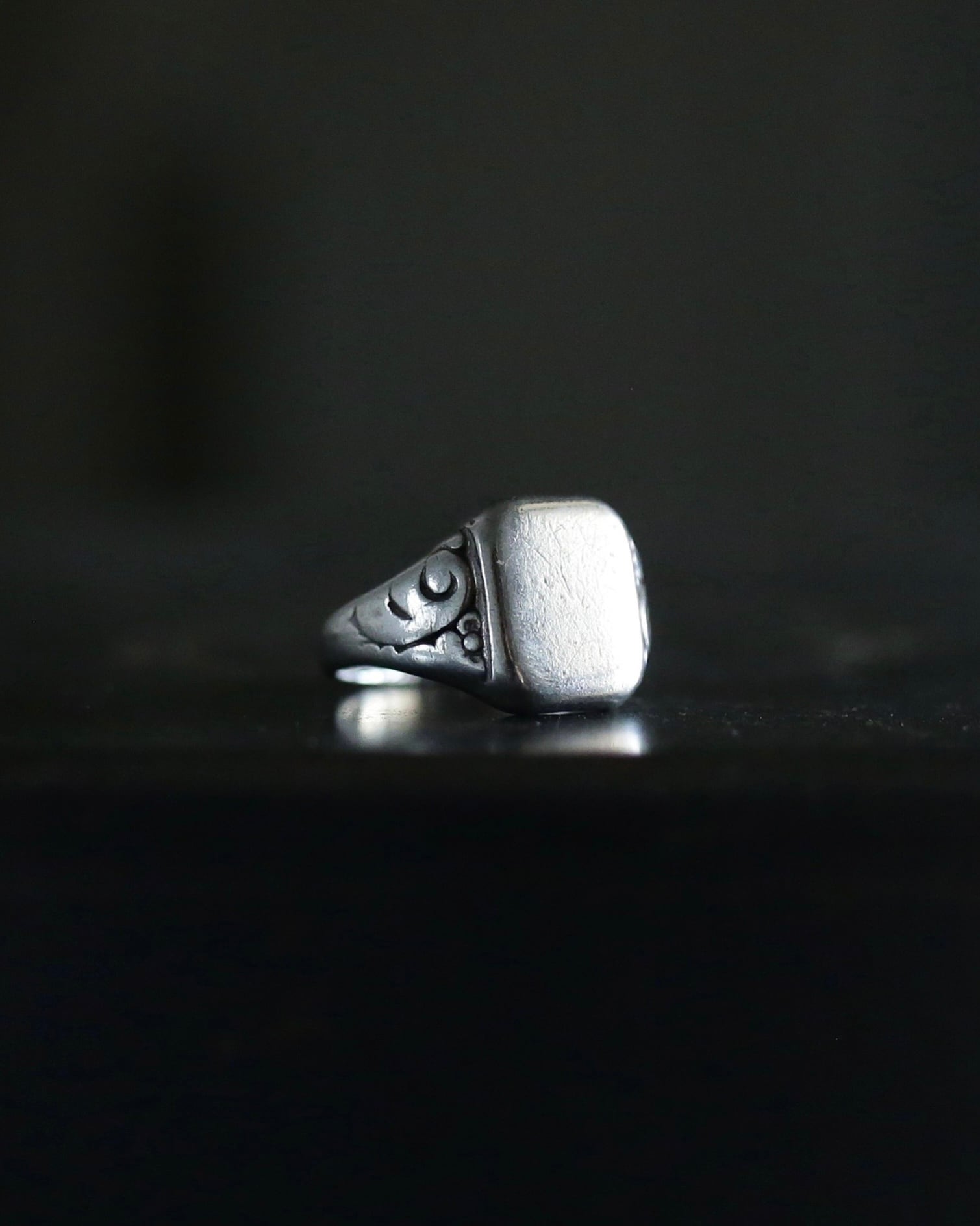 無垢な印台は他のジュエリーを邪魔しにくく、重ね付けにも向いている。